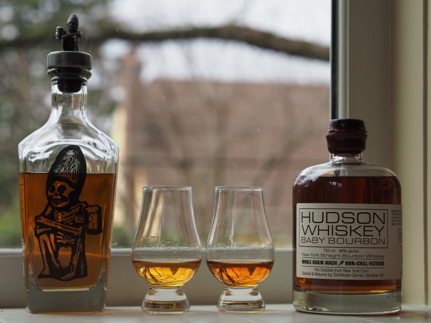 And now I come to the end of my short stint on American Whiskies. I have a backlog of Scotch I’ll get to work on next. But meanwhile, in their American survey, the Whisky Wafflers tried a Hudson single malt (which did not impress but intrigued anyway). This time we’ve got a more typical American-styled spirit from Hudson. I received this ‘Baby Bourbon’ as a gift and thought we’d put it through its paces. Along the way I’ll compare to the other whiskies tried in this series. I don’t have a lot of craft whiskeys to compare yet so we’ll use the Rogue Dead Guy, recently reviewed, as a benchmark as well as the Knob Creek, which has a more traditional mashbill.