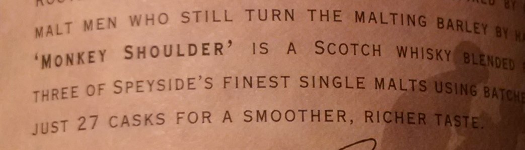 A second clue is that the Monkey Shoulder website claims their malt men are “among the few” who still turn malt manually (most distilleries buy their malt from a central factory). That narrows down the possible contributors to the mix. On the Grant website (here) we read of The Balvenie (emphasis added): “Nowhere else will you find a distillery that still grows its own barley, still malts in its own traditional floor maltings, and still has its own dedicated coopers and coppersmith.”