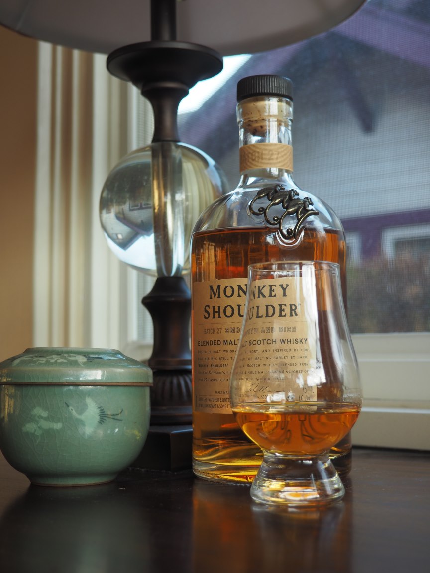 And thus we come to Monkey Shoulder. This Scotch is a blend. But it’s a bit special. In the old days, they would have called Monkey Shoulder a vatted (or blended) malt—a mix of single malts, no grain alcohol added. That William Grant & Sons have produced a vatted malt priced ($32 locally) well below the blacks from both Johnnie Walker and Bushmills is pretty amazing. One wonders how they do it. To determine that, we’ll have to investigate what is in the Monkey Shoulder blend.