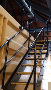 To start the tour, we were directed to a ‘multimedia experience’ in a darkened room on the distillery side of the street. This was slick, well-produced, and pretty typical corporate fare. Yawn. From there we were collected for the tour. We were trooped past clean, shining, well-cared-for machines, to the stainless-steel mash tun and washbacks. The mash tun had a window for viewing. No dusty milling machines or malt de-stoners, and no one was going to lift the lid of a washback here and let fly with the foaming beer-head, no way. I started thinking more fondly of Aberlour’s adventure with the beer tasting. In fact, after climbing up the lovely orange stairs (there is a LOT of orange here) to the still room, we were told ‘no photography.’ Risk of explosion, etc. Which is odd, as we took photos at Glenfarclas (and later at other sites), and no one exploded. Furthermore, the Glenmorangie stills are open to the outside–plenty of venting for all those explosive gases. It being another lovely day in Scotland (how did we get so lucky?), we were able to snap a photo of the still room from the outside (shown on the page banner displayed if you select this blog post).