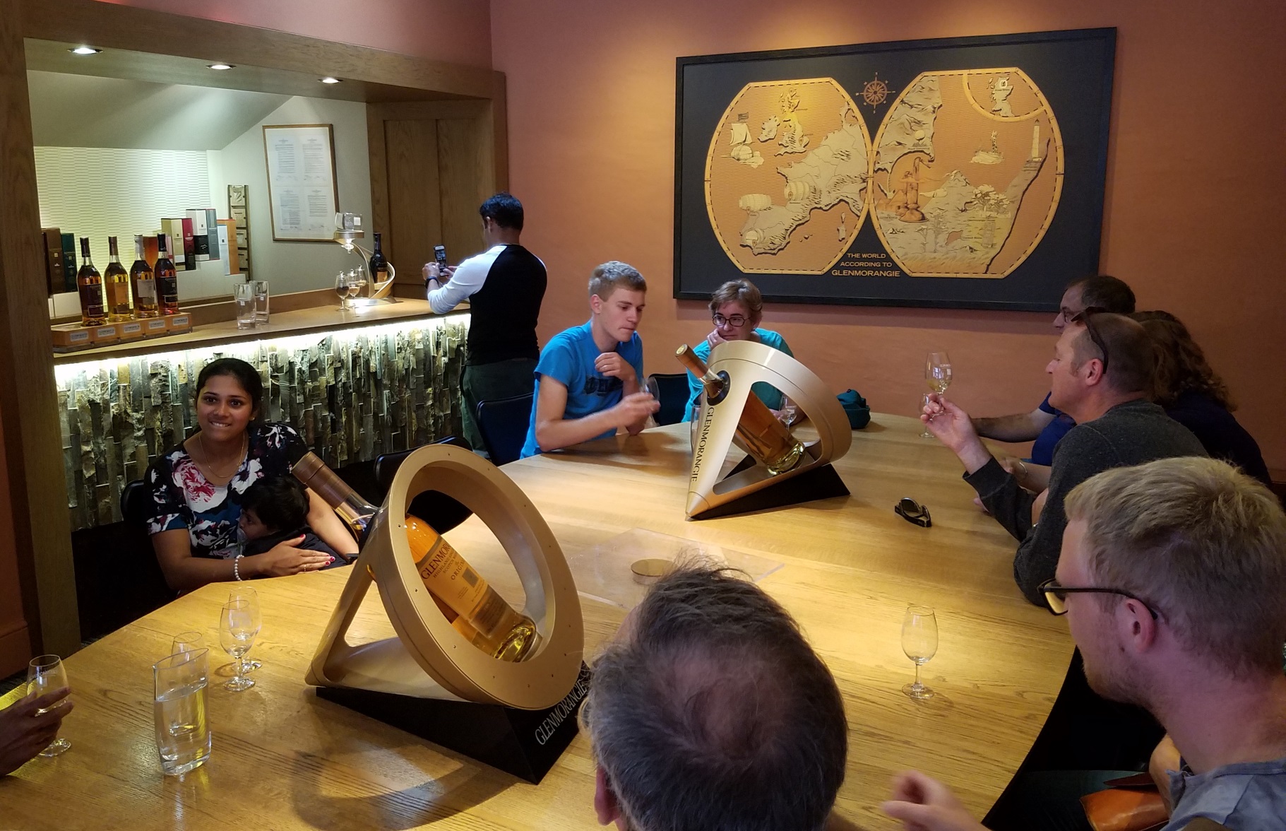 The tasting is basic, a single dram (well poured, at least) but the tasting experience was not one to encourage contemplation. Glenmorangie attracted a much younger crowd than we encountered elsewhere, and folks were doing the tasting without the tour. Hence, families with small children joined us. I don’t mind kids, I’ve had a few of my own, but these kids were acting out, crawling all over the table, making a nuisance of themselves. The display you see in the center of the shot below was upset not long after. So, forewarned, this is not the place to come for a quiet dram with adults. Save that for the smaller less-traveled distilleries. On the plus side, if you have kids, they are welcomed, and you can let them go crazy at the tasting. Let ’em rip! I’ve already been… π