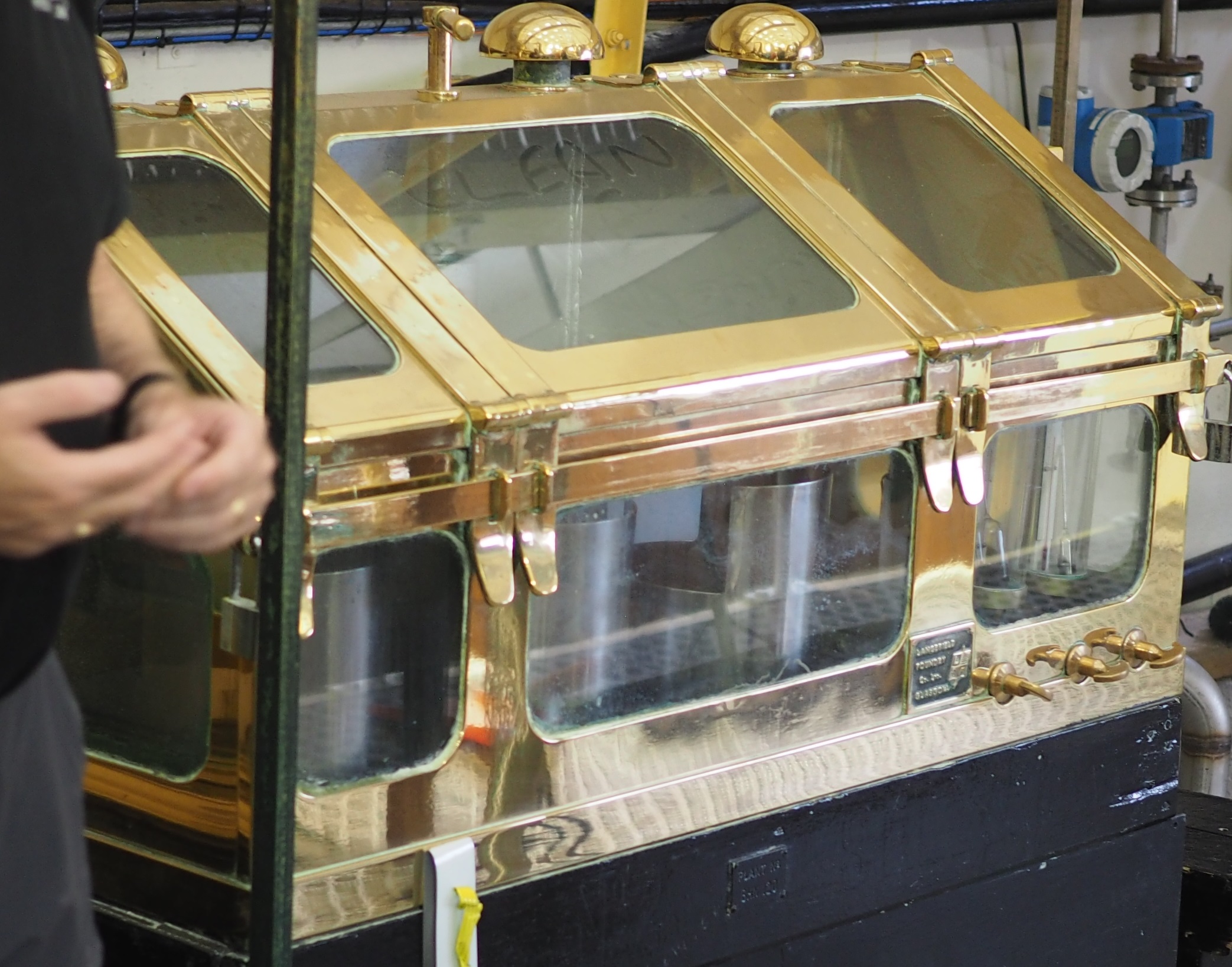 In the spirit stills, the low wines will be about 28% alcohol. During the second distillation, the head, consisting of 90% down to 74% alcohols and esters, distills out within 15 minutes. The heart, the good stuff, takes about 2.5 hours to reach 65% alcohol, and the tail is run down to one percent. These are split out in the spirit safe. Below is a photo of the Bunna spirit safe. Just to think, every bottle of Bunna you’ve tasted cascaded through here. If I were a billionaire I’d have a duplicate made just to have in my man cave. Sigh.