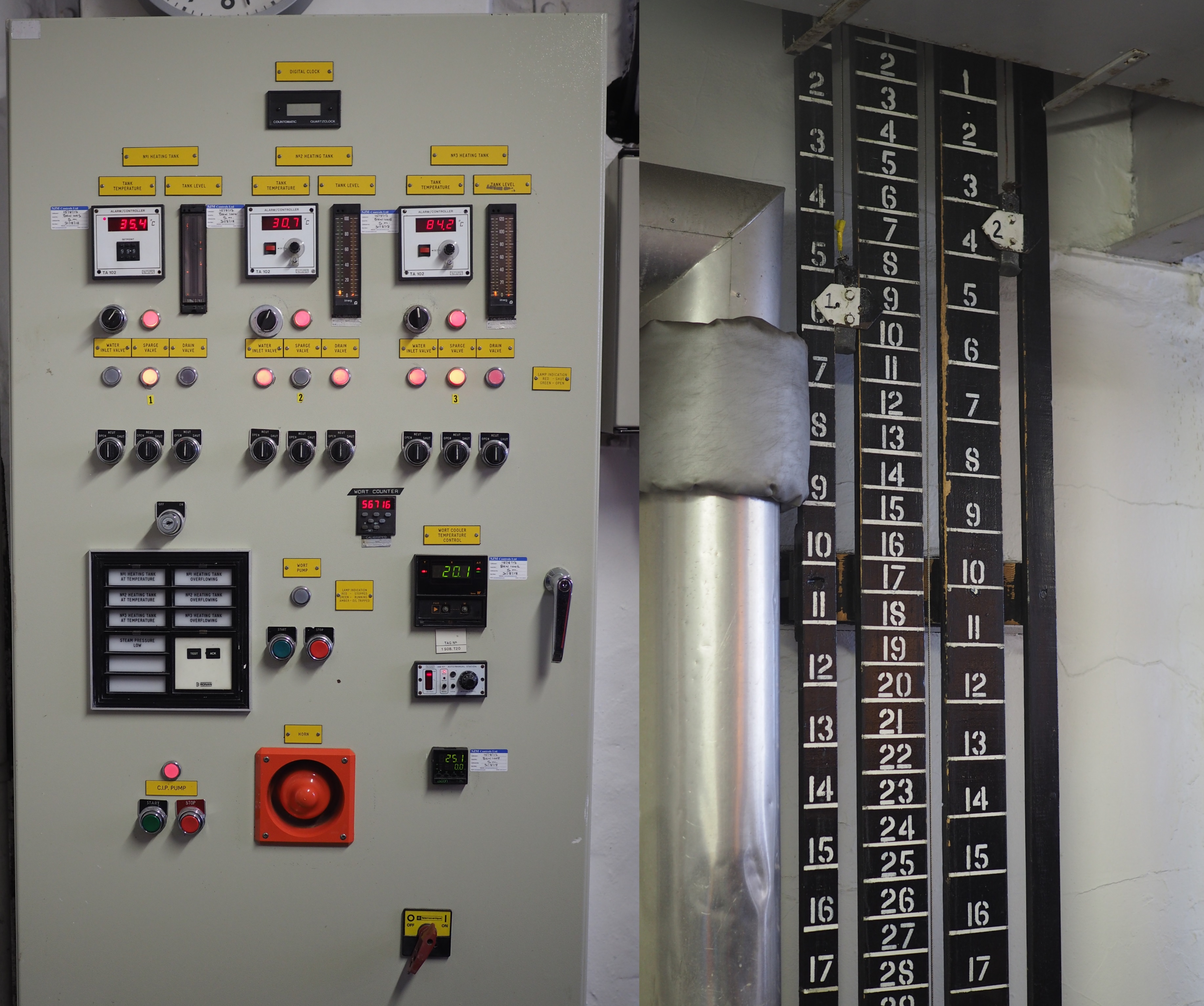Next we went inside where Scott showed off their 1964 Proteus malt grinder, a deep red beauty with a bespoke wooden hopper; we then filed past a control panel and up the stairs to a worn-out calculator, held together with tape and hope, and beam balance by which they analyzed each new batch of malted barley. The balance and measuring tools are used to determine the density of the grind. The wooden brewer’s box is where it starts. A sample from the mill is added and the box is then shaken 80 times. By then, the screens inside will have filtered the grist into husk, grit and flour. They fine-tun the mill based on the density — too much flour and the mash is too dense, too much husk and the mash is too watery.