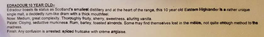 I first encountered Edradour whisky at The Ship Inn, located on the water in a little town called Stonehaven. Stonehaven is just north of Dunnottar Castle on the east coast of Scotland. The Ship Inn had a hefty book full of single malts to try and I liked their description of the Edradour 10-year. You can read the description in the photo below. It was a good dram, and I was pleased to find when I returned to the US I could find a 10-year ‘Distillery Edition’ in my state. I do not know if it is the same expression as I had at the Ship inn, as that might have been their cask-strength version, which is also 10-year aged (and non-chill-filtered).