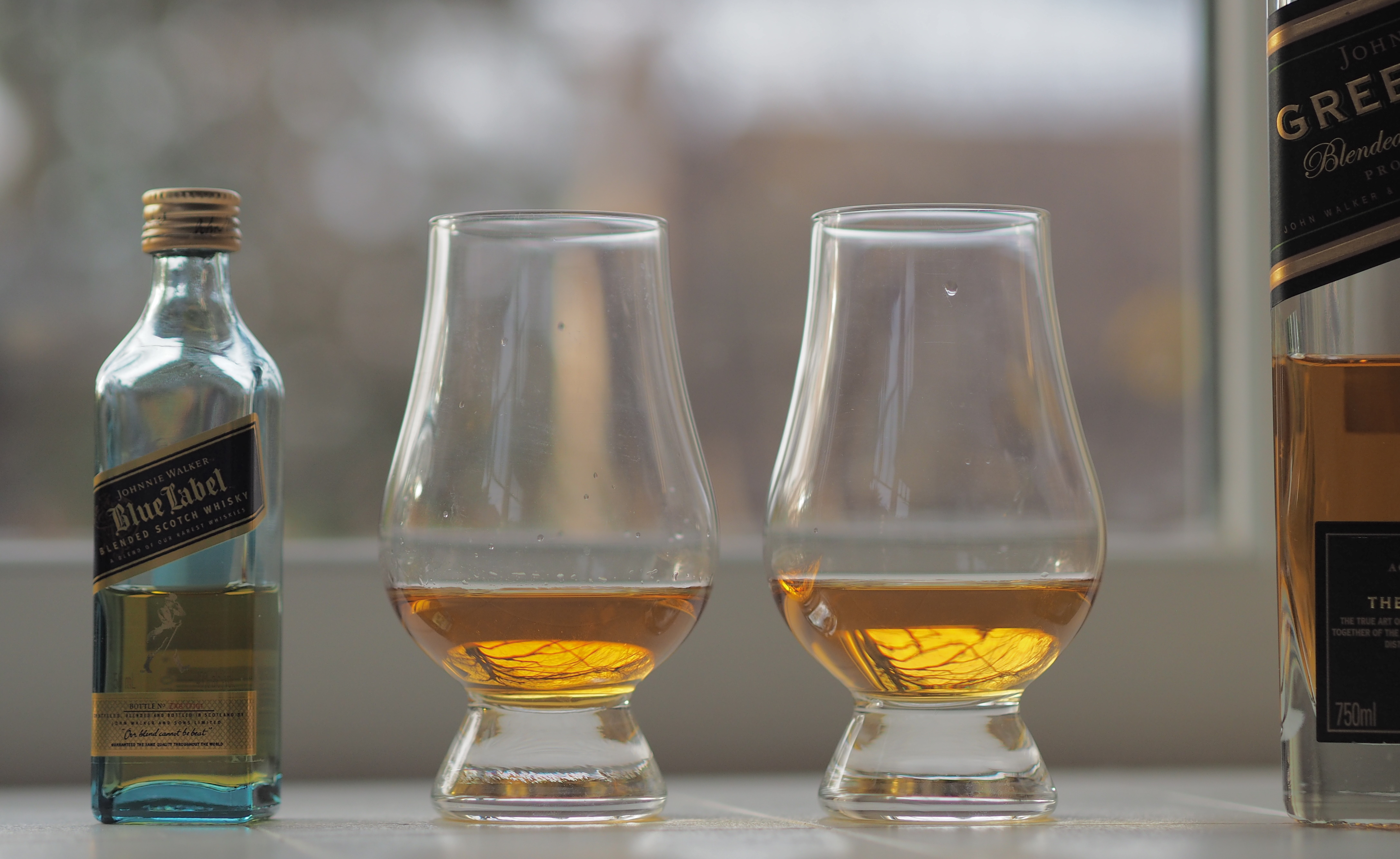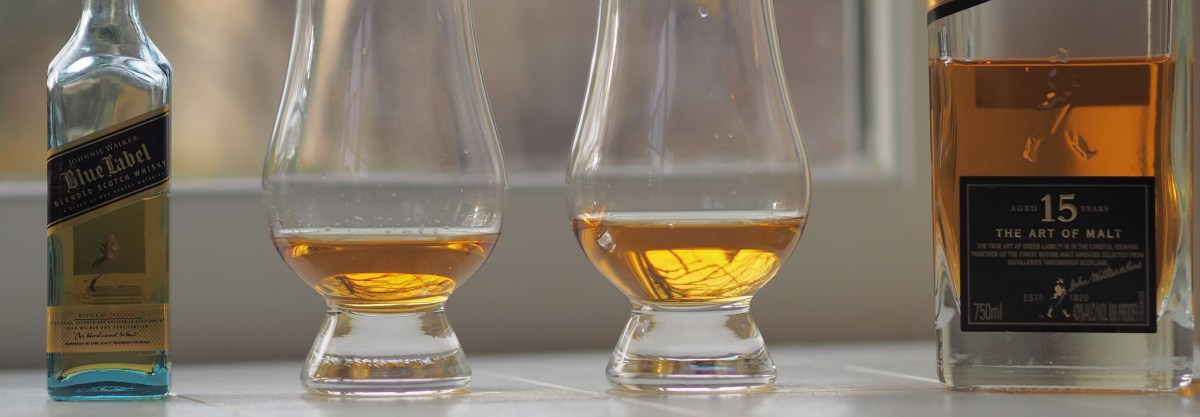 I wondered how to assess this little gem. I don’t have any other expensive blends besides a bottle of the JW Green Label, so we’ll try that. Frankly I don’t expect a true contest on the value front. The Green is only one third the price of the Blue (the Green is $60 in Oregon), and the Green, being a blended malt – not a blended whisky – is made from 15-year old malts. There are no grain whiskies in the Green. The Blue, being a blend, contains some grain whisky, and being NAS, you don’t know how old (or young) those “1 in 10000” casks are.