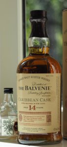 I first had this whisky at the distillery, as it was one of the tasters at the end of the tour. I was impressed then, have owned it, but forgot to review it. It’s an unusual finishing (rum cask) of the Balvenie, whose Doublewood I have reviewed favorably. In this case, however, we have an extra couple years aging on ex-bourbon barrels, then an unspecified time finishing in rum casks. I’m excited about the extra years’ maturation, as the 14 to 15-year rage is a sweet spot for Scotch; Oban 14 and the Glenlivet 15 both being examples of tasty spirits in that age range. (I have two more 15s coming, up, a Dalwhinnie and a Glenfiddich so watch this space).