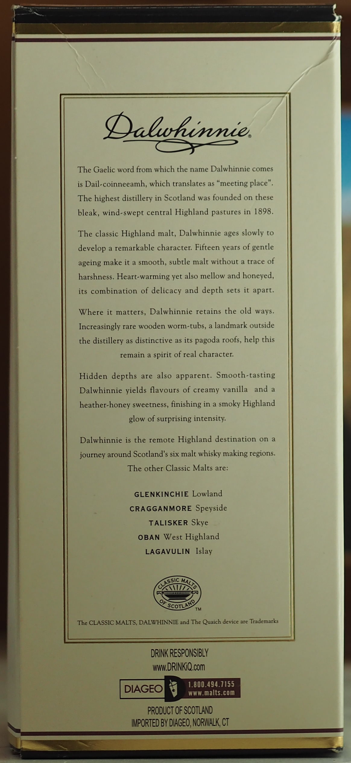 From a marketing perspective, Dalwhinnie 15 is an original inclusion in Diageo’s “Classic Malts” series. It is in good company, with Glenkinchie 12, Cragganmore 12, Oban 14, Talisker 10 and Lagavulin 16, covering the other regions (Lowland, Speyside, West Highland, Skye and Islay). The group was launched in 1988, though for background you’ll have to rely on Wikipedia or any of the many other whisky blogs out there—Diageo does not have a page on the group themselves, though their Bar Academy site mentions the collection.