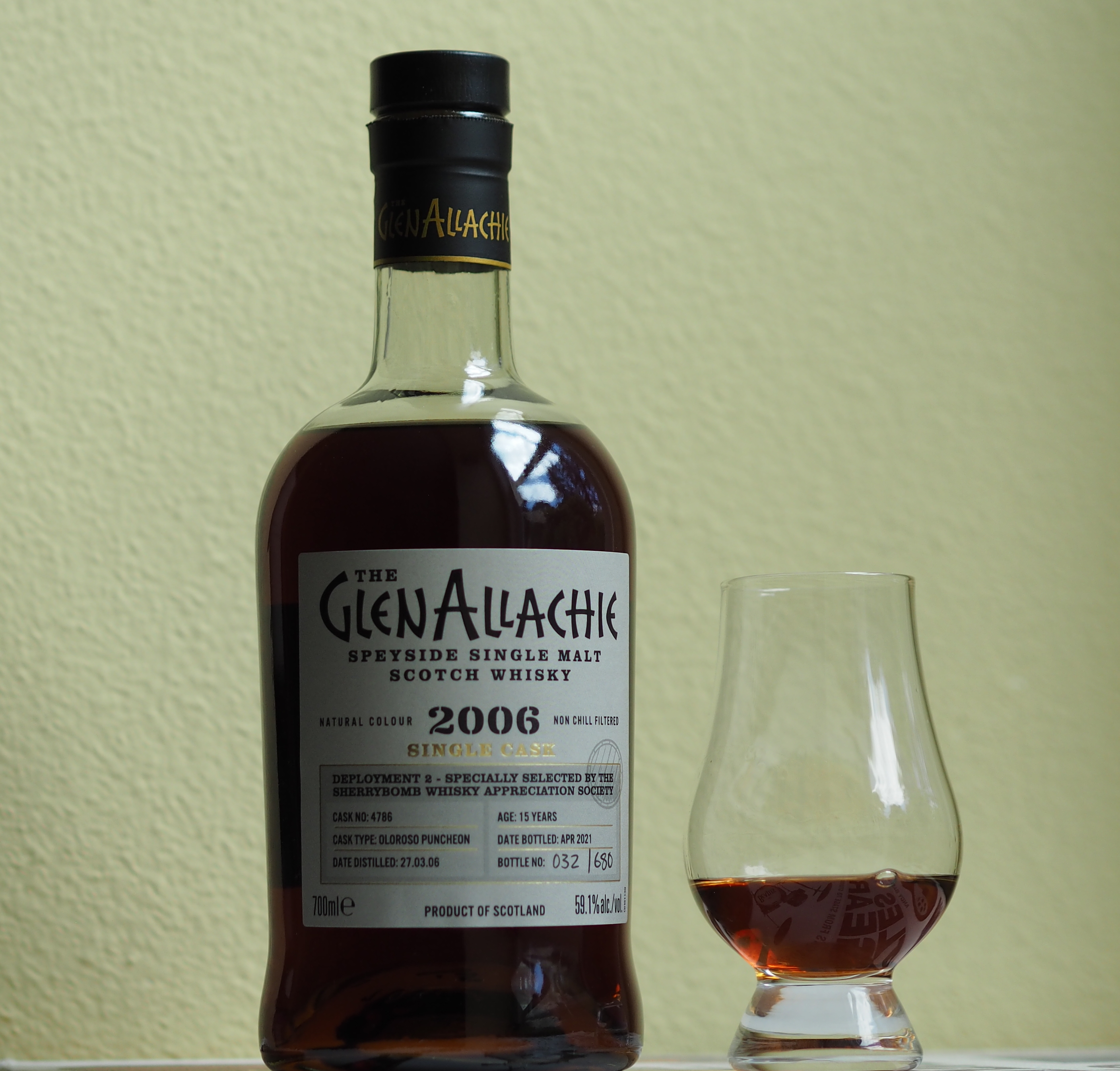 The sturdy GlenAllachie carton announces that this spirit is “Deployment 2 Specially selected by the sherrybomb whisky appreciation society.” The age of 15 years and the cask number (4786) are printed, bottle number hand written. Although they only produced 295 bottles from said cask my bottle number is a cryptic ‘032 | 680.’ Inside one finds the classically stout bottle and the somewhat Flintstones-style script of the GlenAllachie name on the label. The style is fetching, and gives the whisky a lighthearted air.