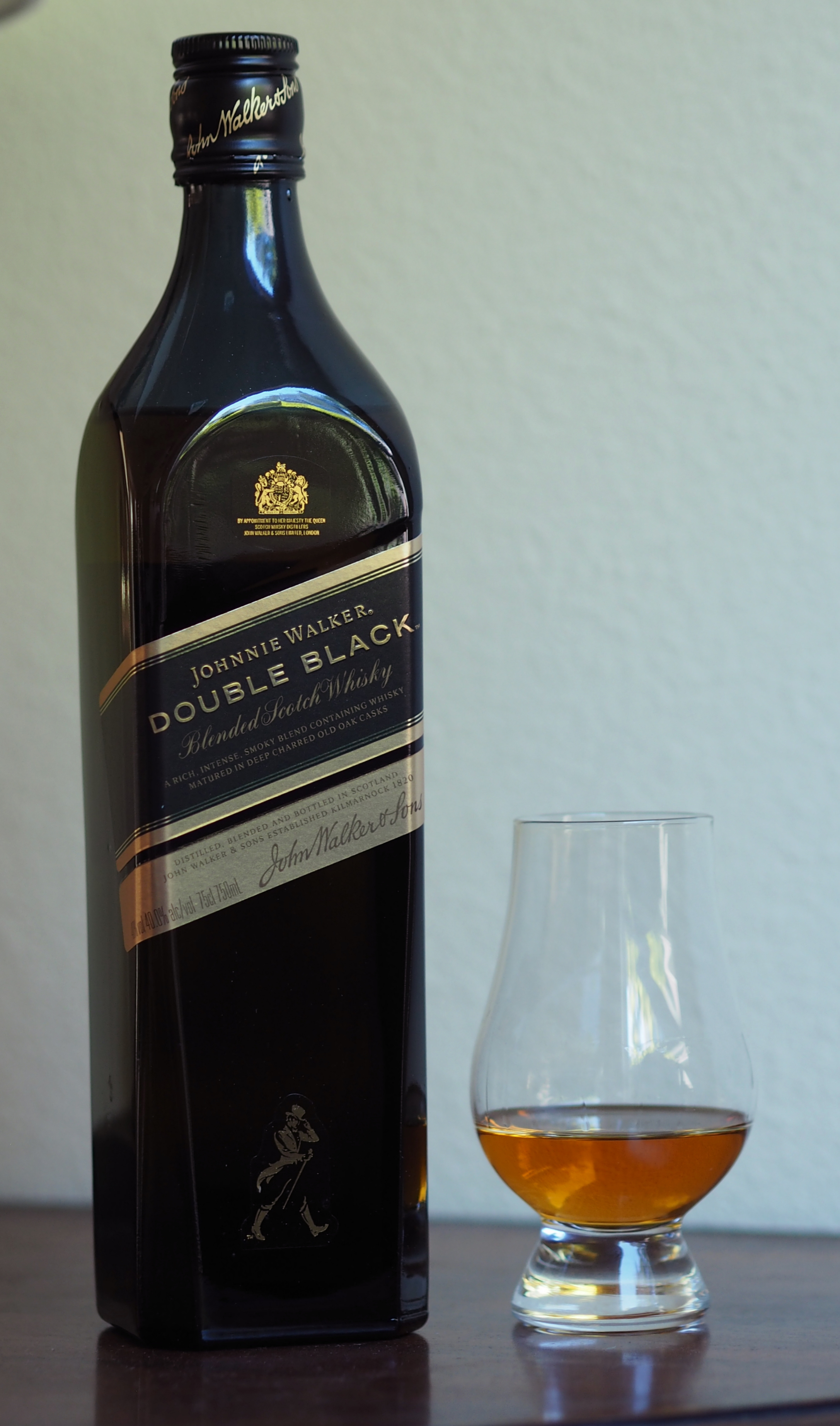 I have long relied on Johnnie Walker’s 12-year old ‘Black Label’ blended whisky (aka JWB) as a standard everyday drinking whisky and a standard of quality against other blends. I’ve compared JWB to Ballantine’s, Johnnie Walker’s Green Label and special releases, various other ‘two Jackson‘ ($40) whiskies, a Compass Box blend, and Dewar’s Ancestor. And today we’re at it again, comparing the Johnnie Walker ‘Double Black’ to the venerable JWB.
