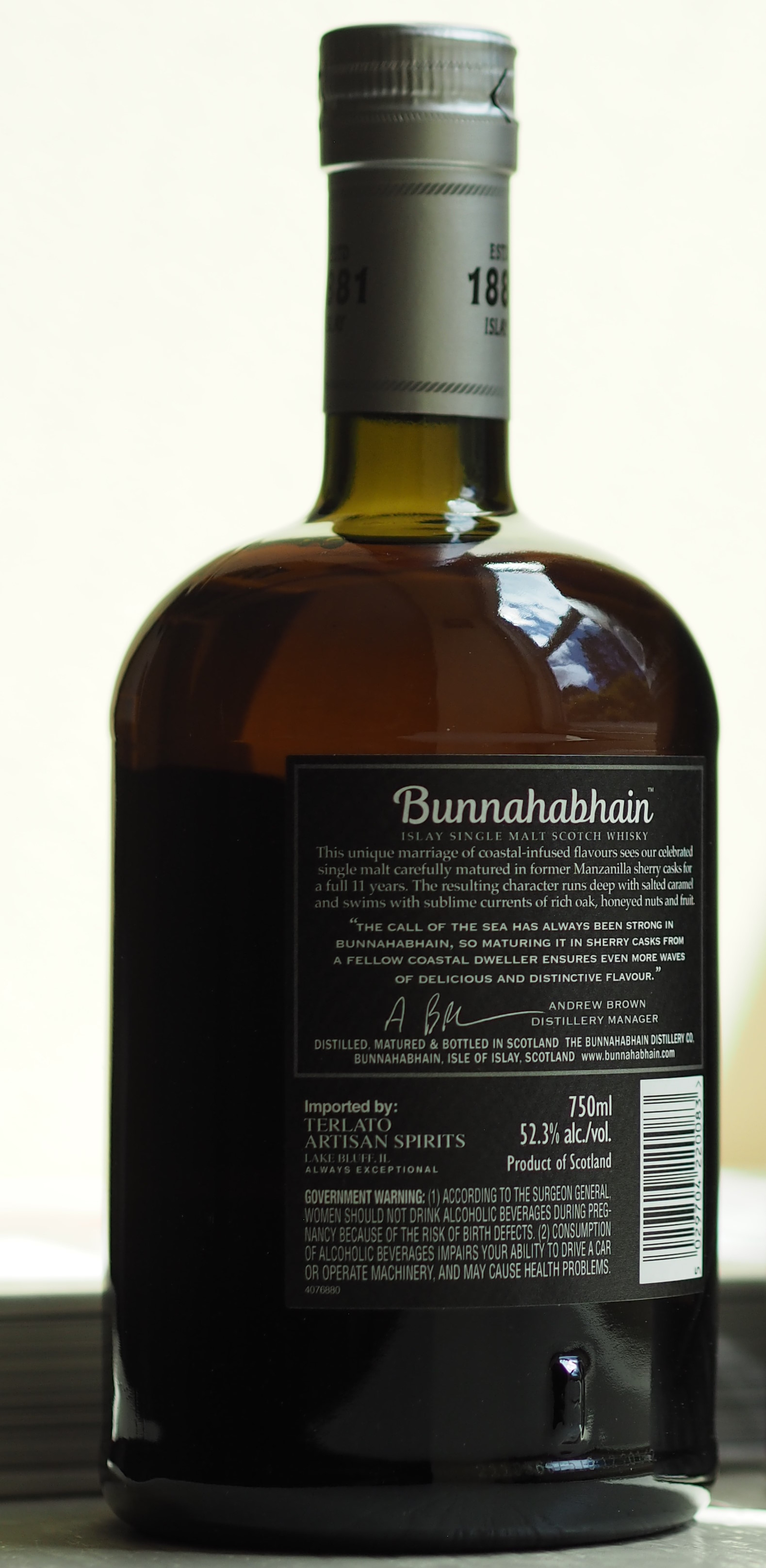 Let’s see how this 11-year-old stacks against good old Bunna 12, which differs in its approach to aging. The standard Bunnahabhain is aged 12 years, with 30% of the casks being ex-bourbon and 70% being ex-sherry (or sherry seasoned. more precisely. The ABV of this limited release is higher than standard, the 12 being bottled at 46.3% ABV, where the Manzanilla release is bottled at 52.3%.
